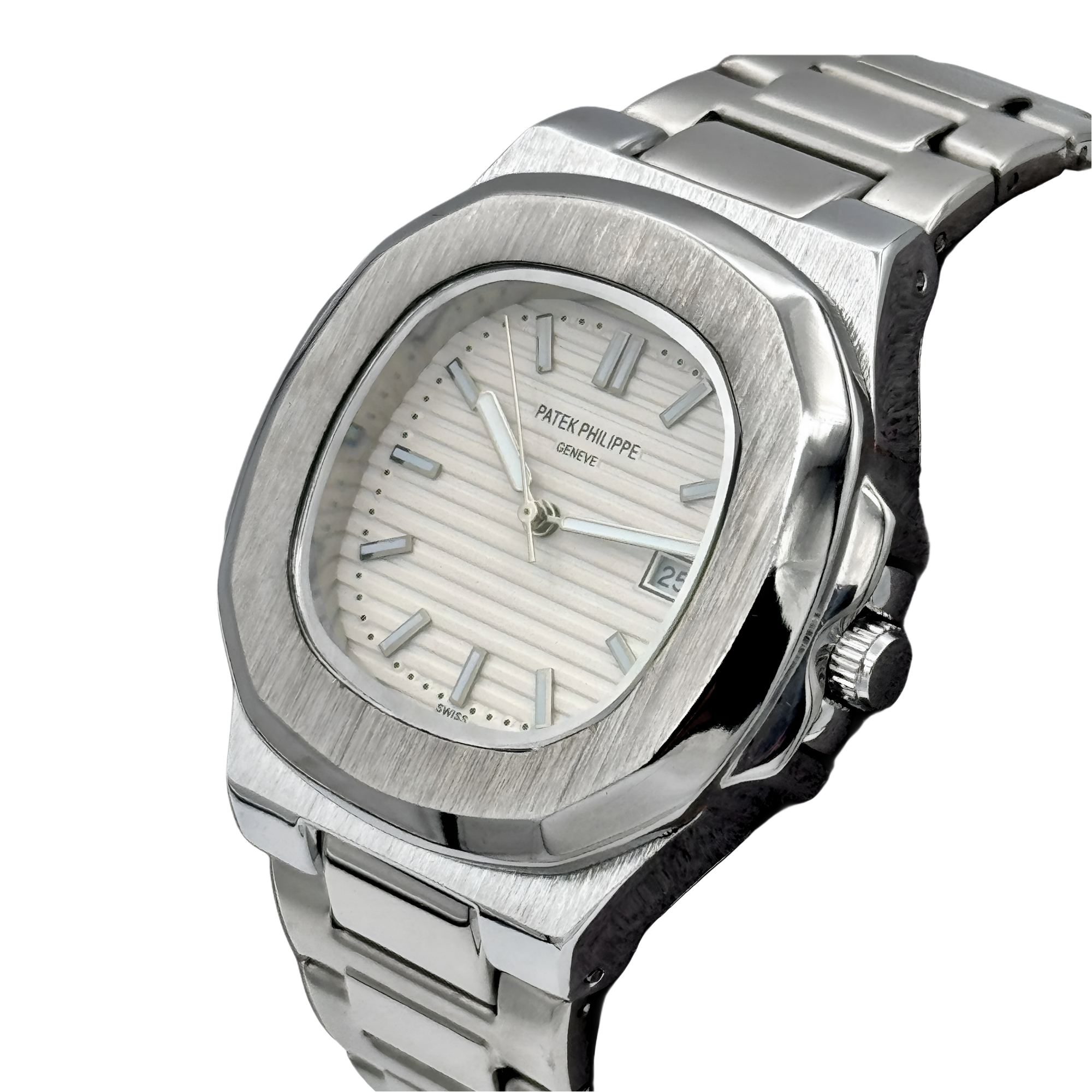 The Patek Philippe Nautilus in white represents the pinnacle of luxury sports watchmaking. This iconic timepiece features the brand's distinctive integrated bracelet design and octagonal bezel, crafted from premium white gold or stainless steel. The white dial showcases exceptional finishing with applied indices and a date window, while the self-winding movement ensures reliable precision. A symbol of horological excellence and refined taste, the Nautilus commands respect among collectors and connoisseurs worldwide. Its timeless aesthetic transcends trends, making it an enduring investment piece that epitomizes Swiss watchmaking mastery.
